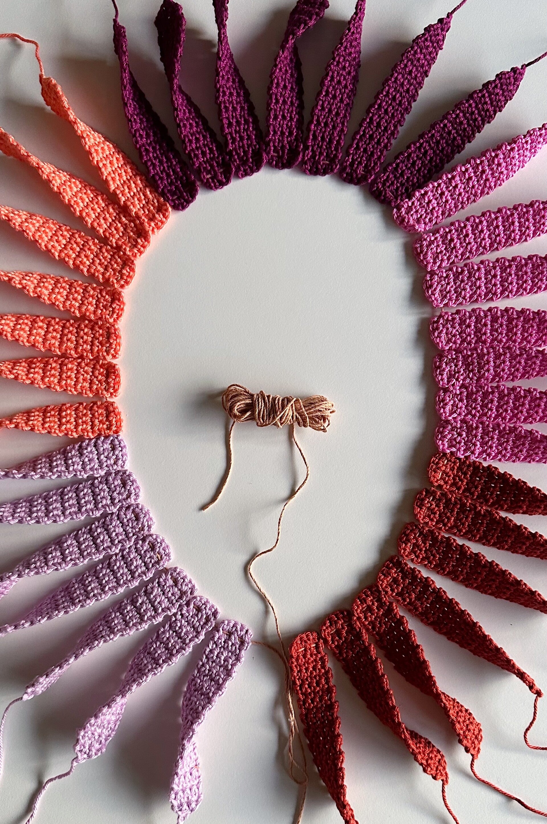 De TWIST slinger bestaat uit 35 TWIST strookjes, verdeeld over ongeveer 3,5 meter. De totale lengte van de slinger is ongeveer 5 meter. Het garen waarmee de strookjes zijn gehaakt is gemerceriseerd katoen. Dit is een sterk garen en heeft een mooie glans. Per slinger kies ik voor een bijpassend draad/garen waar ik de strookjes aan rijg. Deze kan dus variëren per slinger.